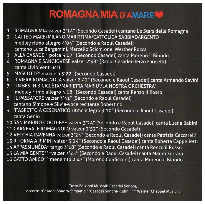 ROMAGNA MIA – GATTEO MARE/MILANO MARITTIMA/CATTOLICA SABBIADARGENTO – ALLA CASADEI – ROMAGNA E SANGIOVESE – MASCOTTE – RIVIERA ROMAGNOLA – UN BES IN BICICLETA/MARIETTA MARIU’/IL PASSATORE – T’ASPETTO A CESENATICO – SAN MARINO GOOD-BYE – CARNEVALE ROMAGNOLO – VECCHIA RAVENNA – RITORNA A RIMINI – APPASSIUNEDA – LA MIA GENTE – GATTO AMICO