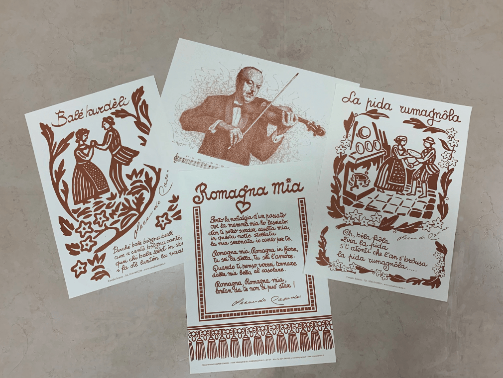Serie 4 stampe su cartoncino con immagine Secondo Casadei, testo Romagna mia, canzoni romagnole e disegni della tradizione.